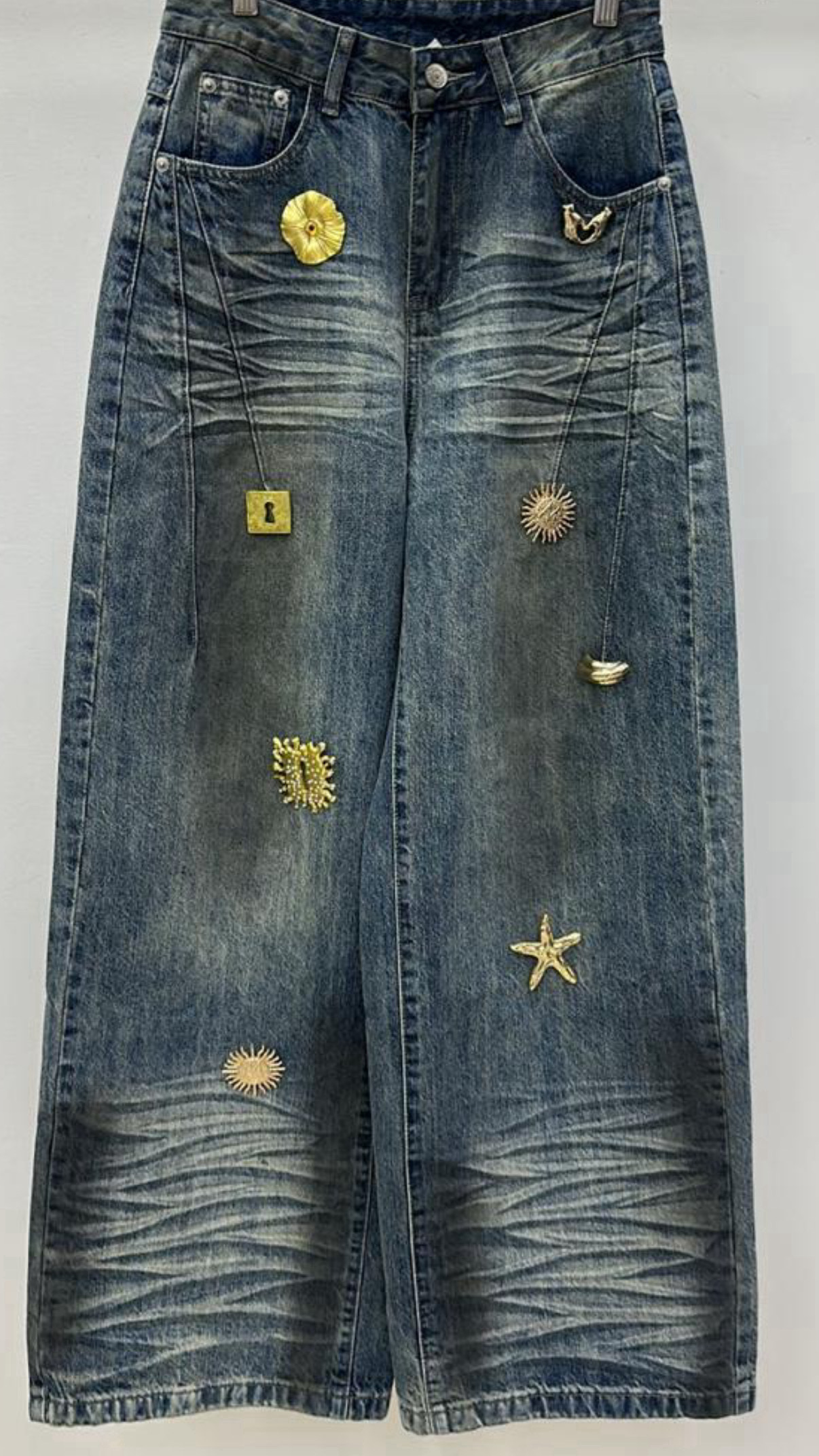 Jeans de tiro alto con efecto desgastado y detalles dorados que elevan todo el look: estrellas, soles y charms que le dan un vibe único 💫