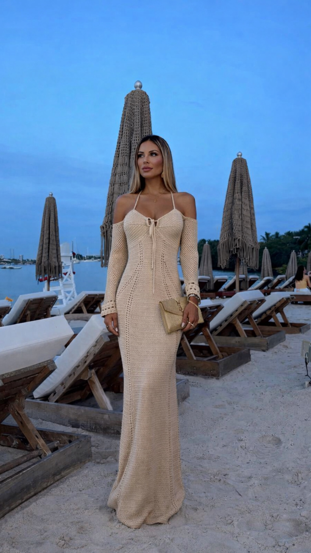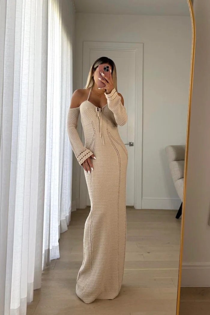 Impresionante vestido de ganchillo seguramente será tu nuevo maxi favorito, hecho en suave punto de ganchillo con un ligero estiramiento que se moldea a tu figura.
