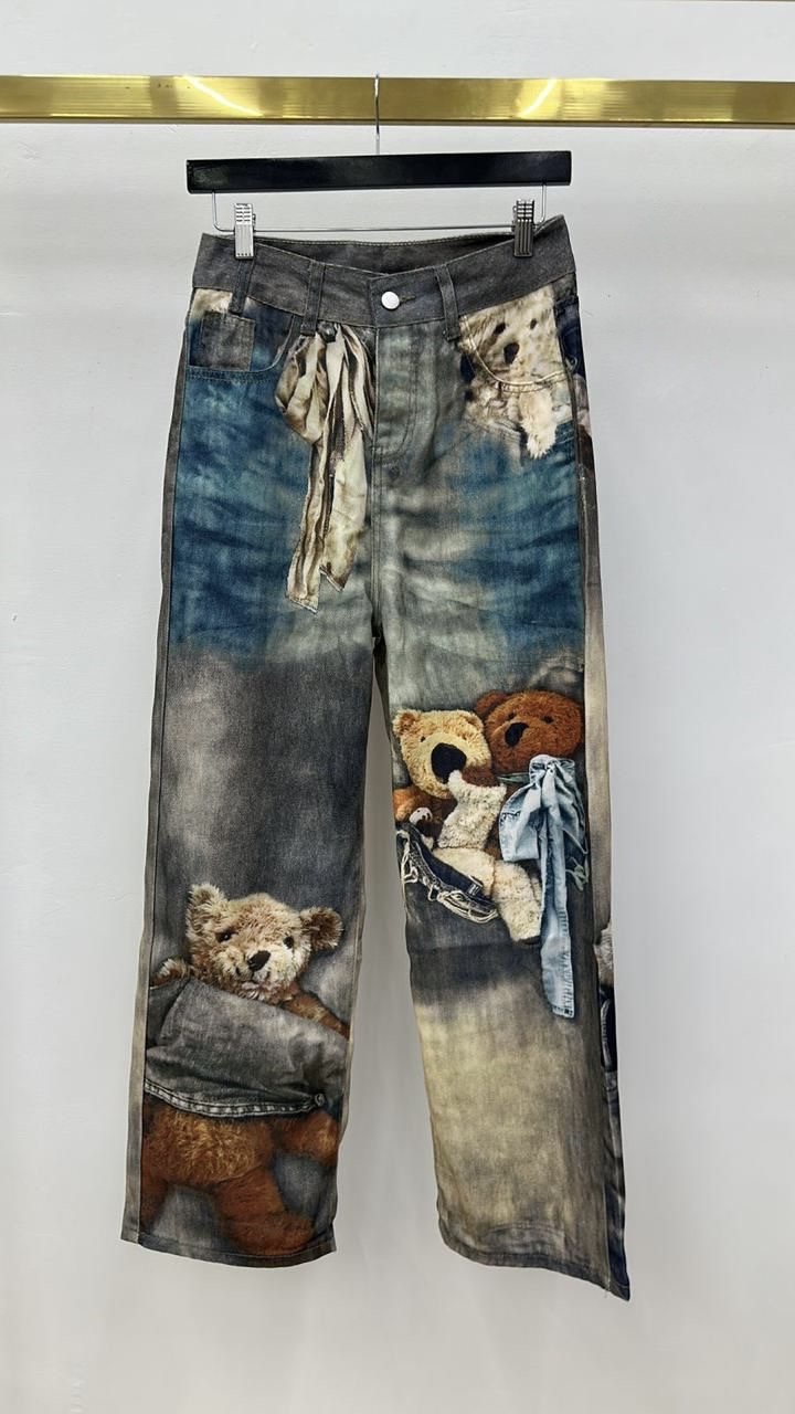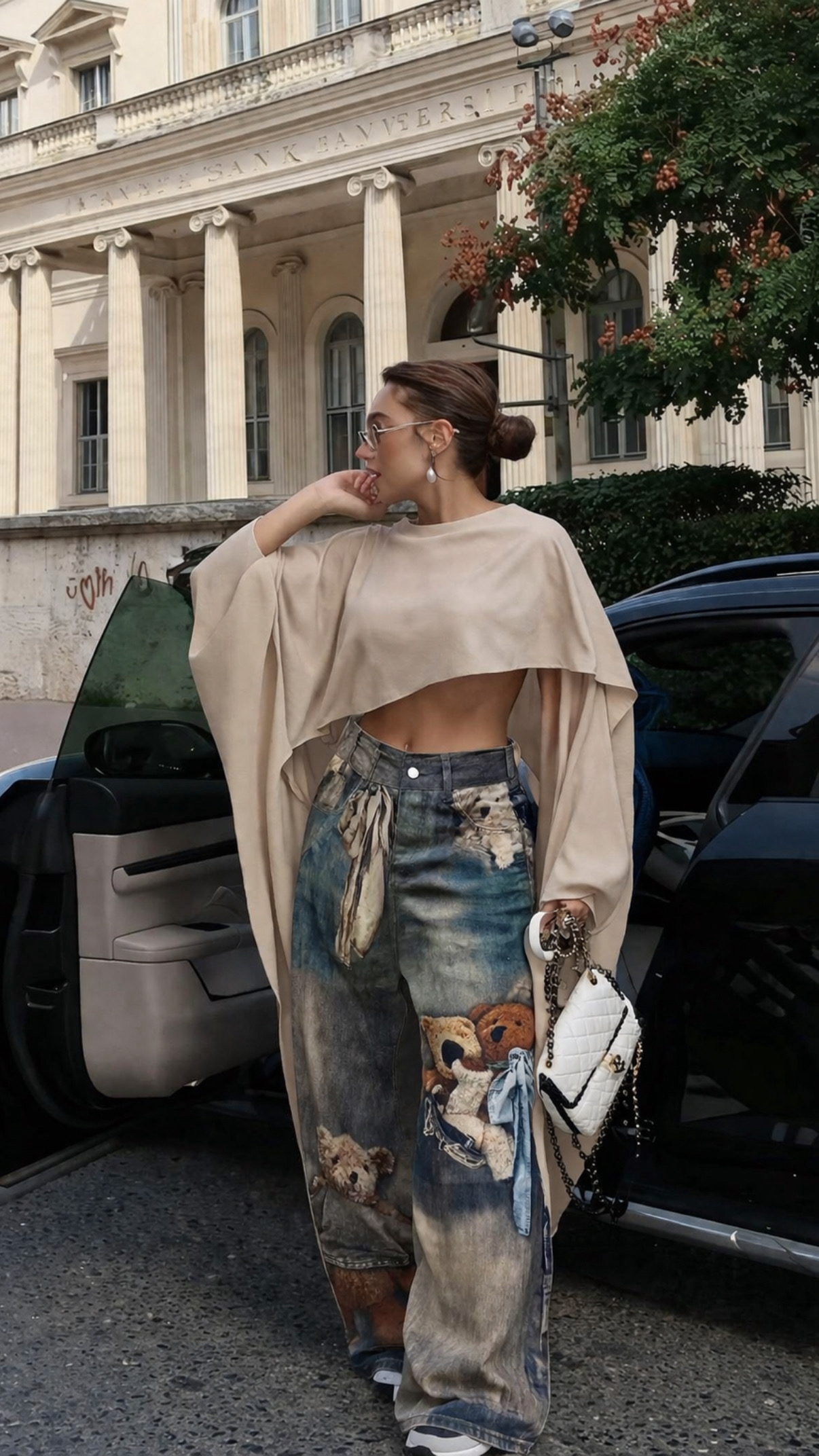 Este pantalón es puro statement piece ✨: un denim wide leg de tiro alto con vibra vintage y un twist artístico que roba miradas. Su silueta holgada cae con actitud effortless, mientras el estampado tipo collage con ositos le da ese toque inesperado, cute pero edgy al mismo tiempo.