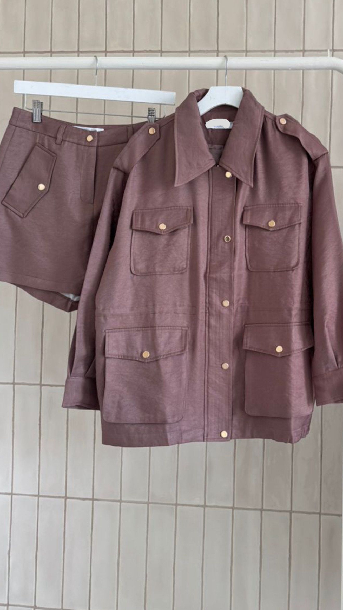 Conjunto de blusa tipo chamarra y falda en un tejido satinado. No estira. COMPOSICIÓN :