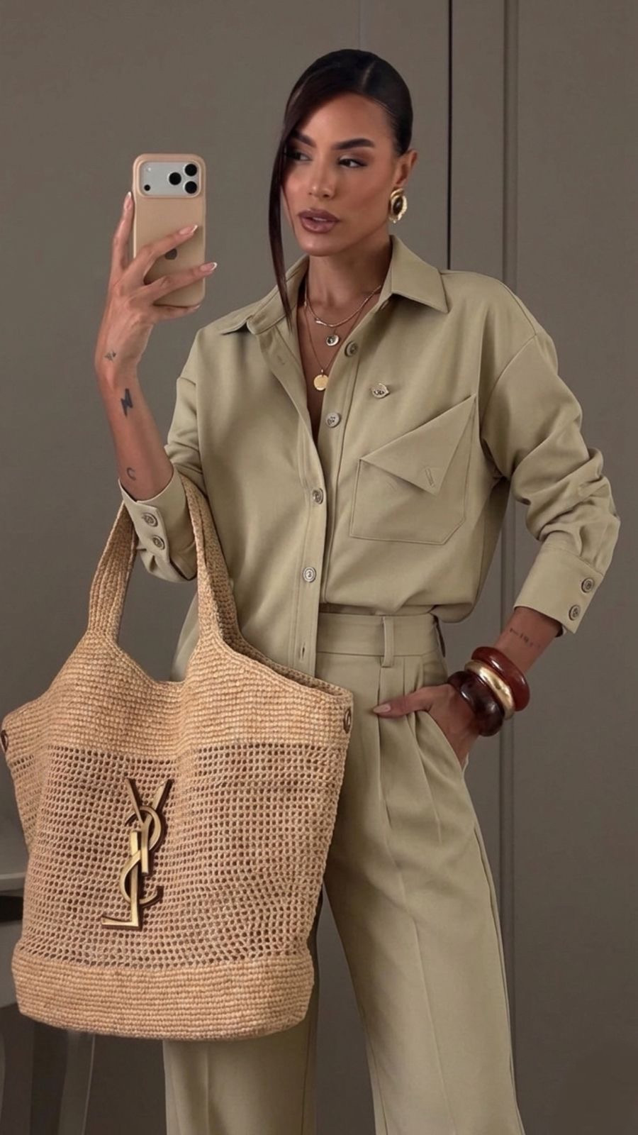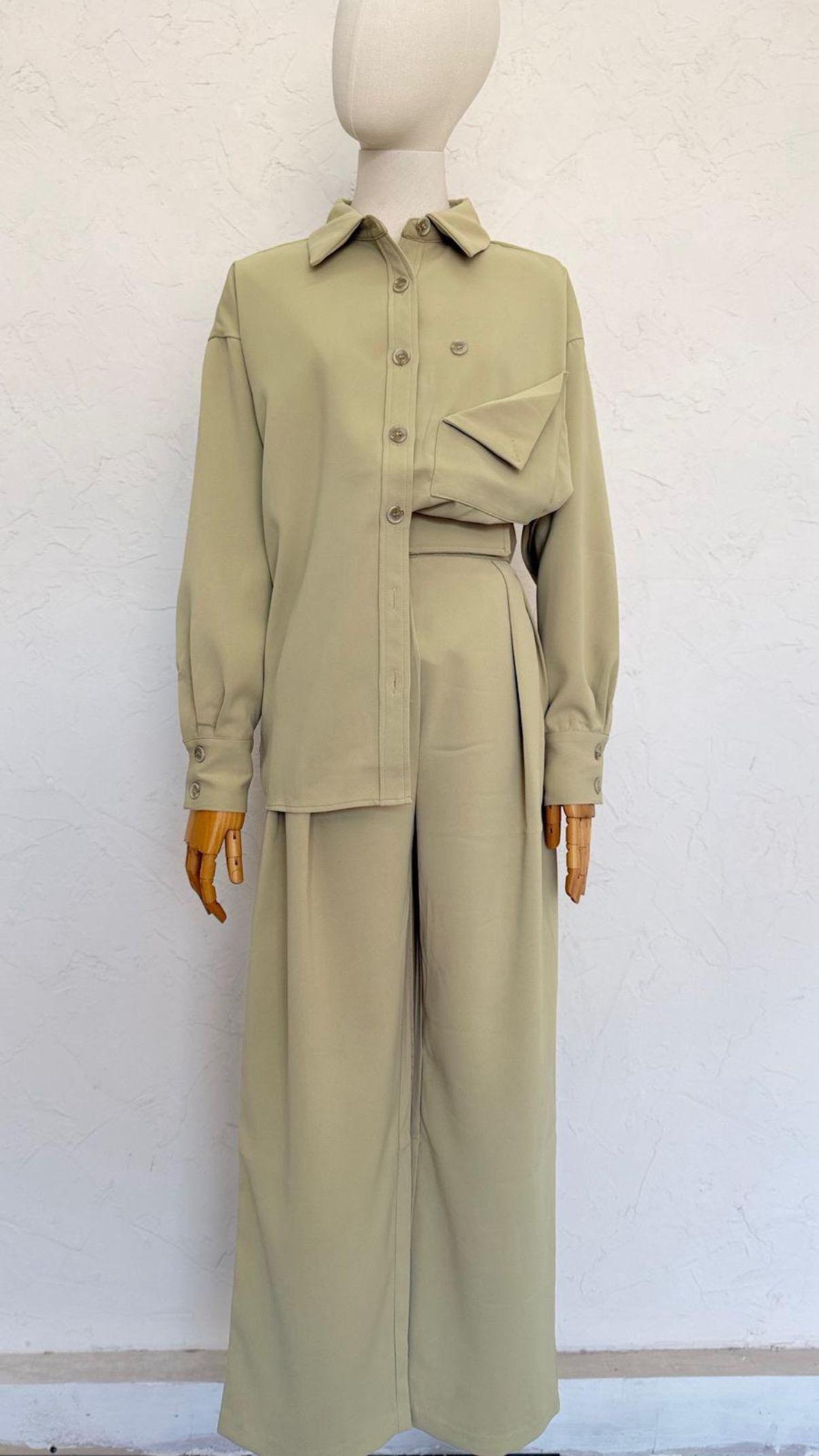 Conjunto de camisa amplia con botones y bolsillo frontal, combinado con pantalón de caída recta que estiliza la silueta. Un look sofisticado y atemporal, perfecto para destacar con elegancia.