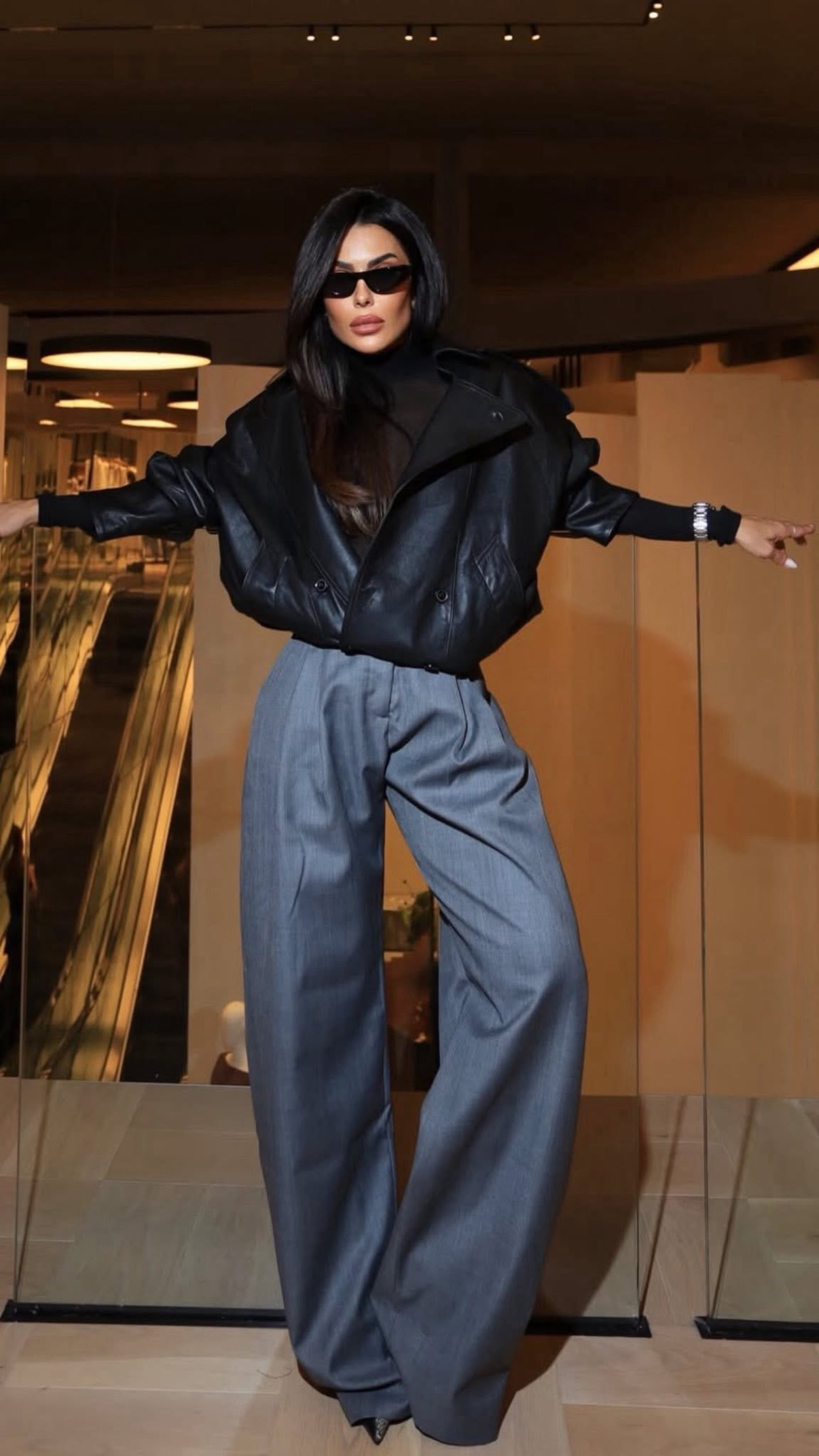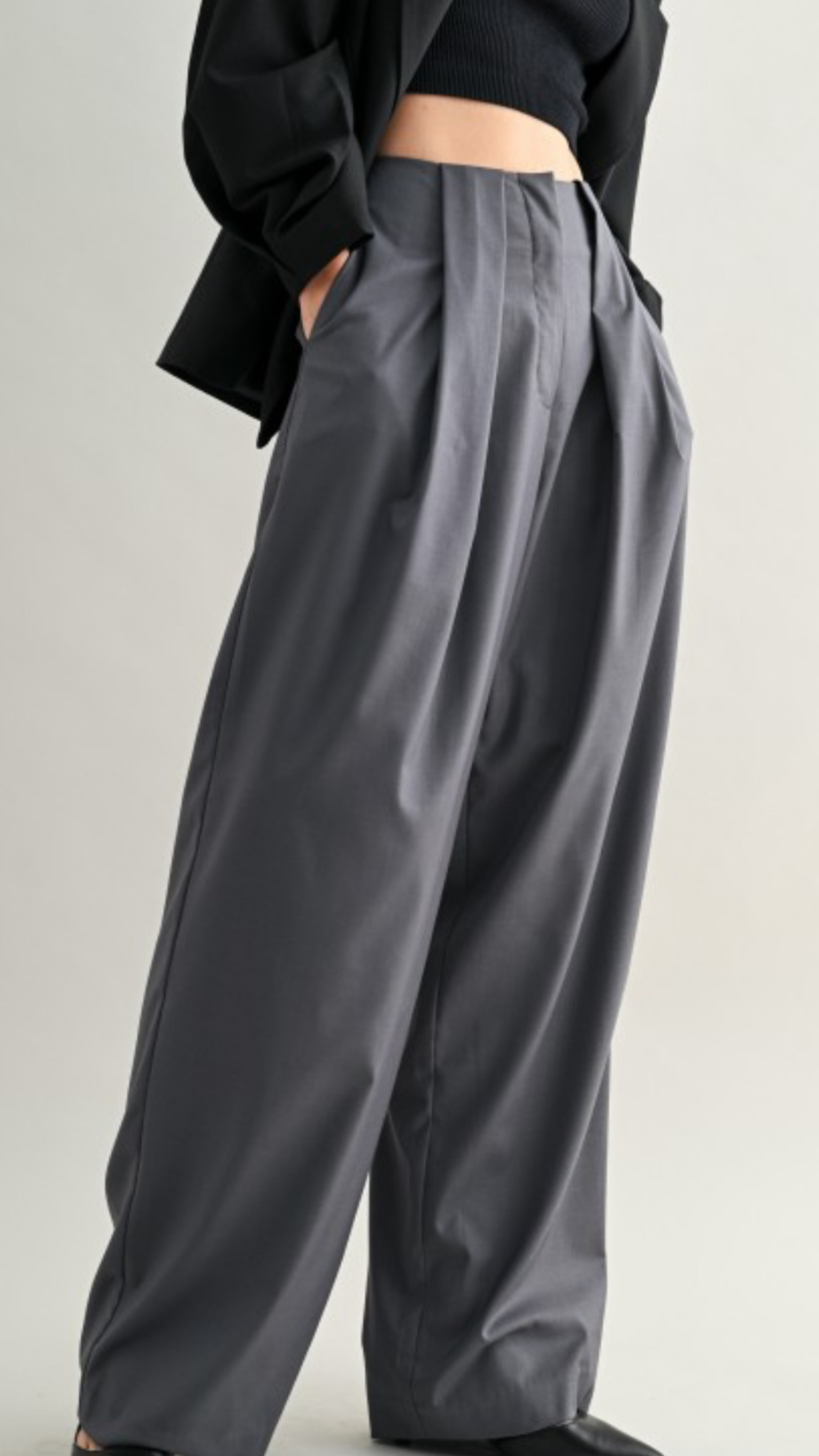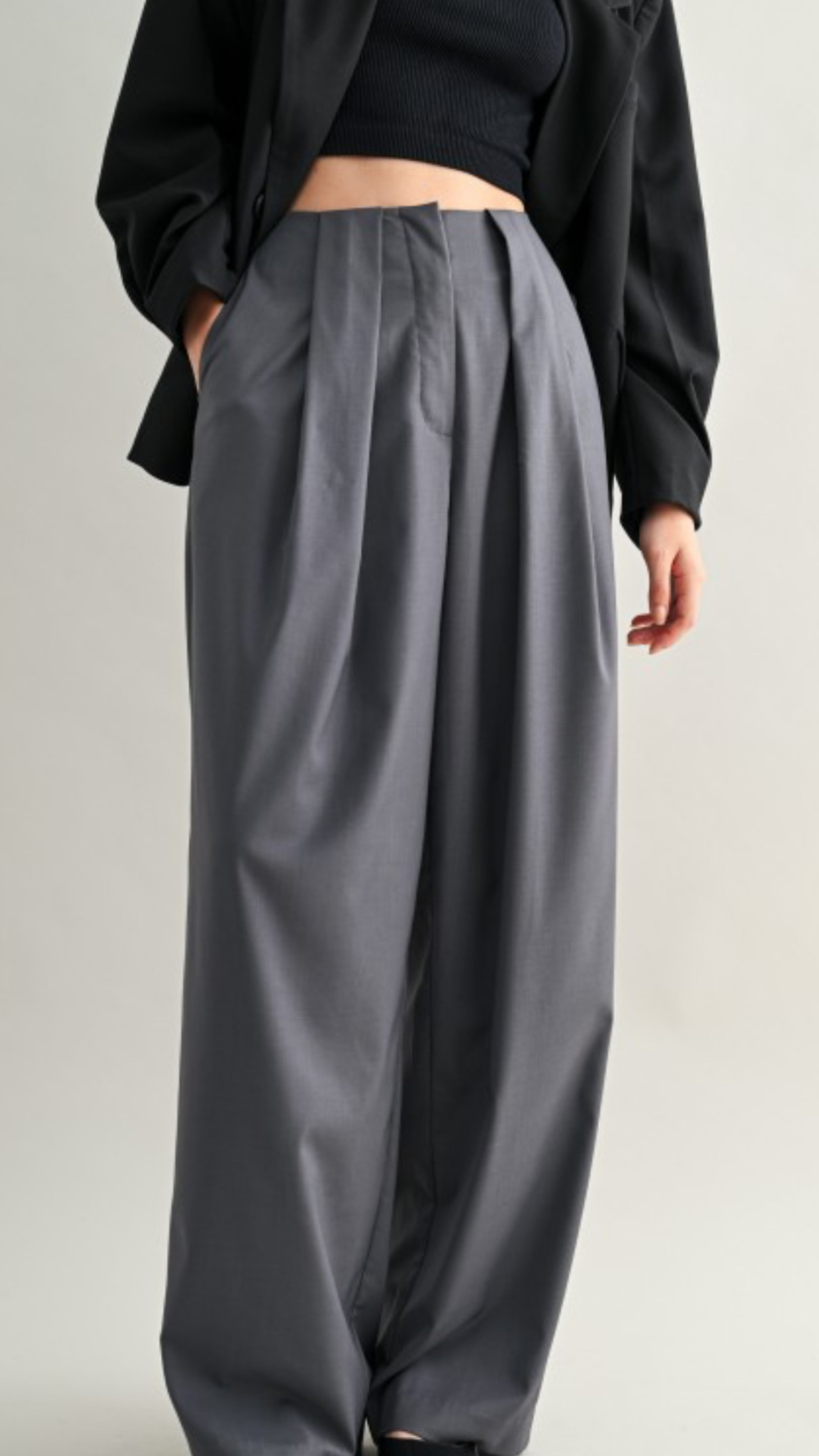 Mid-waisted solid suit trousers with a wide-leg silhouette and double pleated front detailing. Designed with hook and eye, zipper and side pockets.