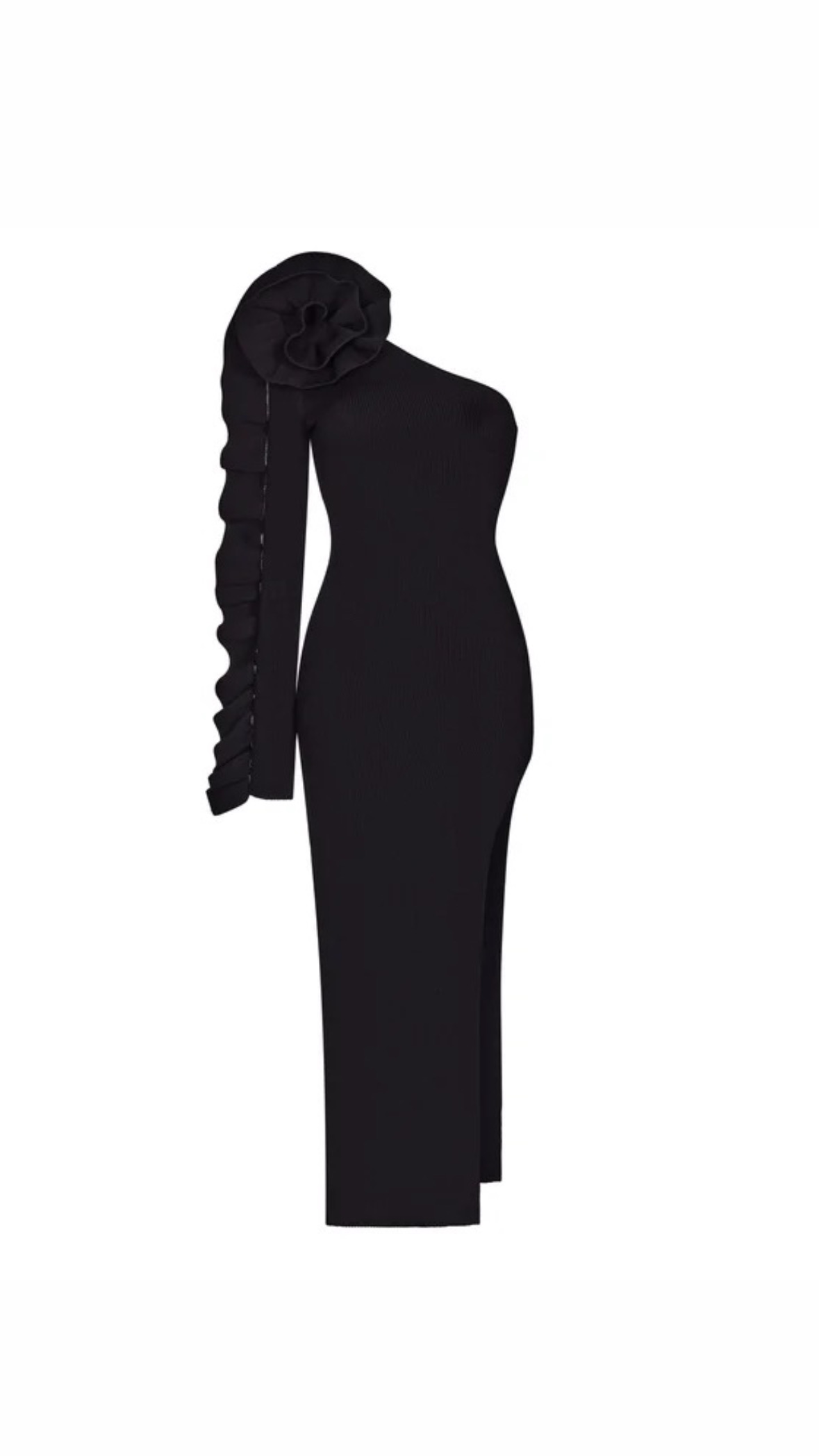 Vestido bandage one shoulder. Detalle de volantes en manga. Cremallera invisible en el la parte posterior.