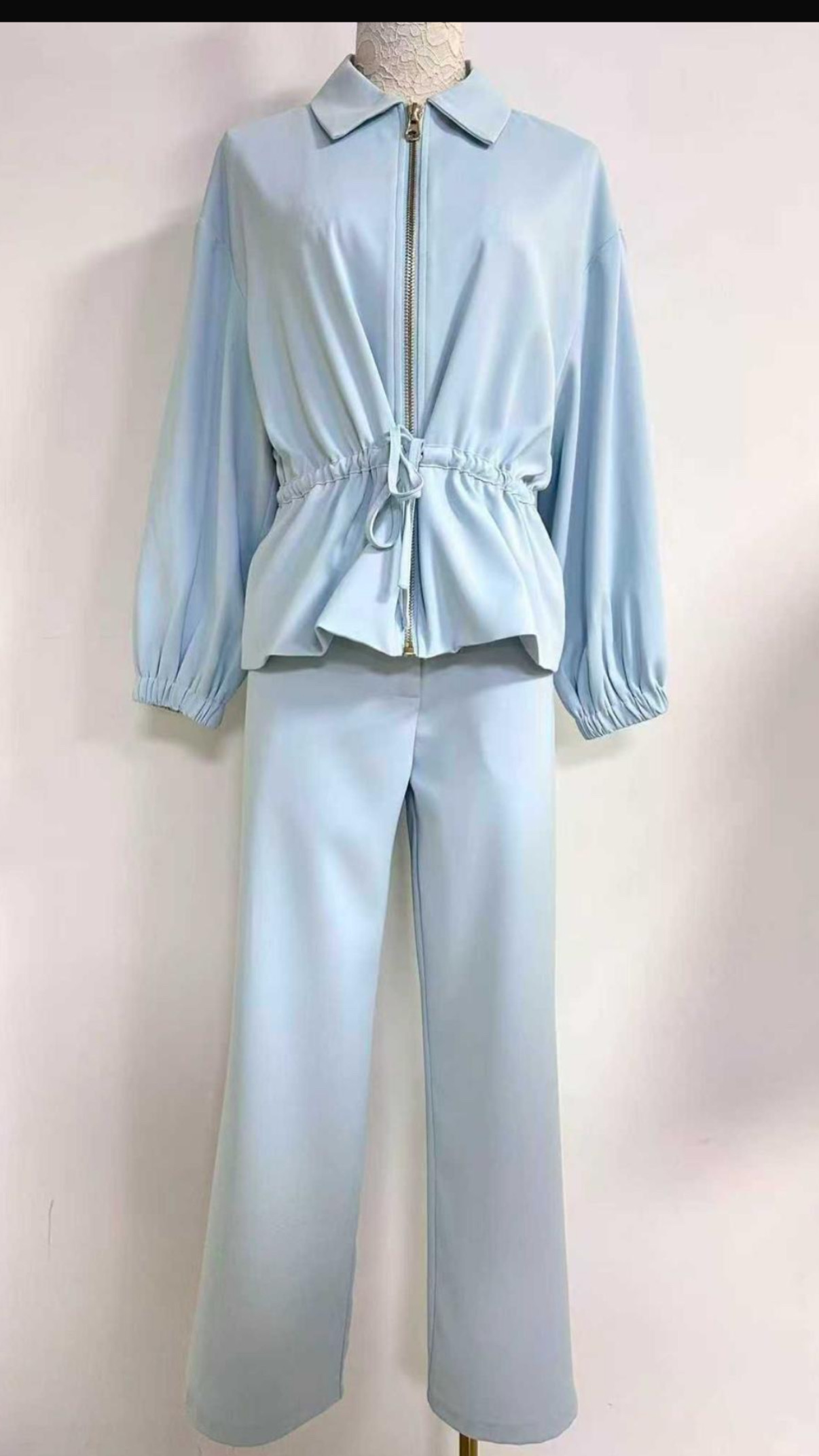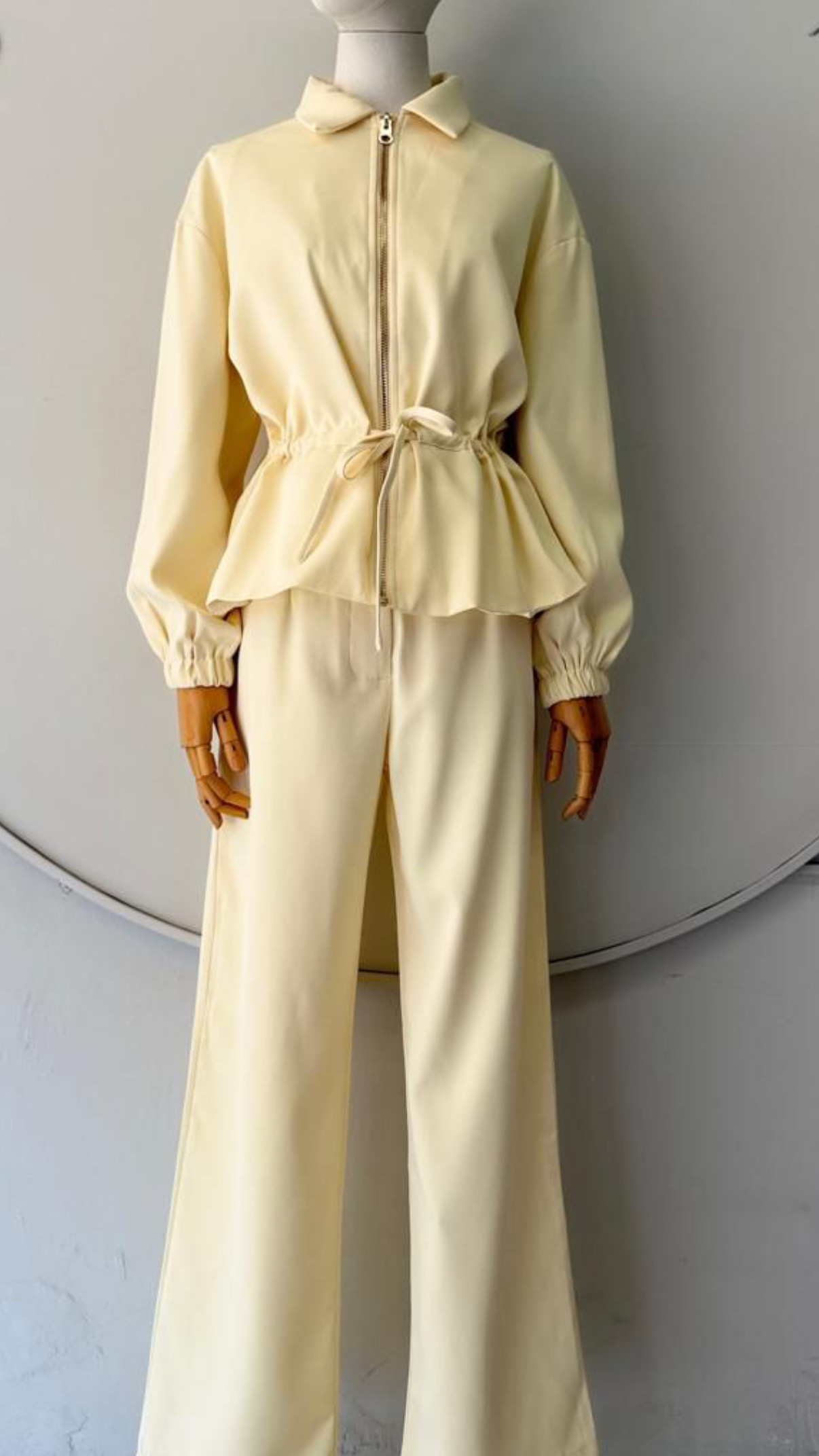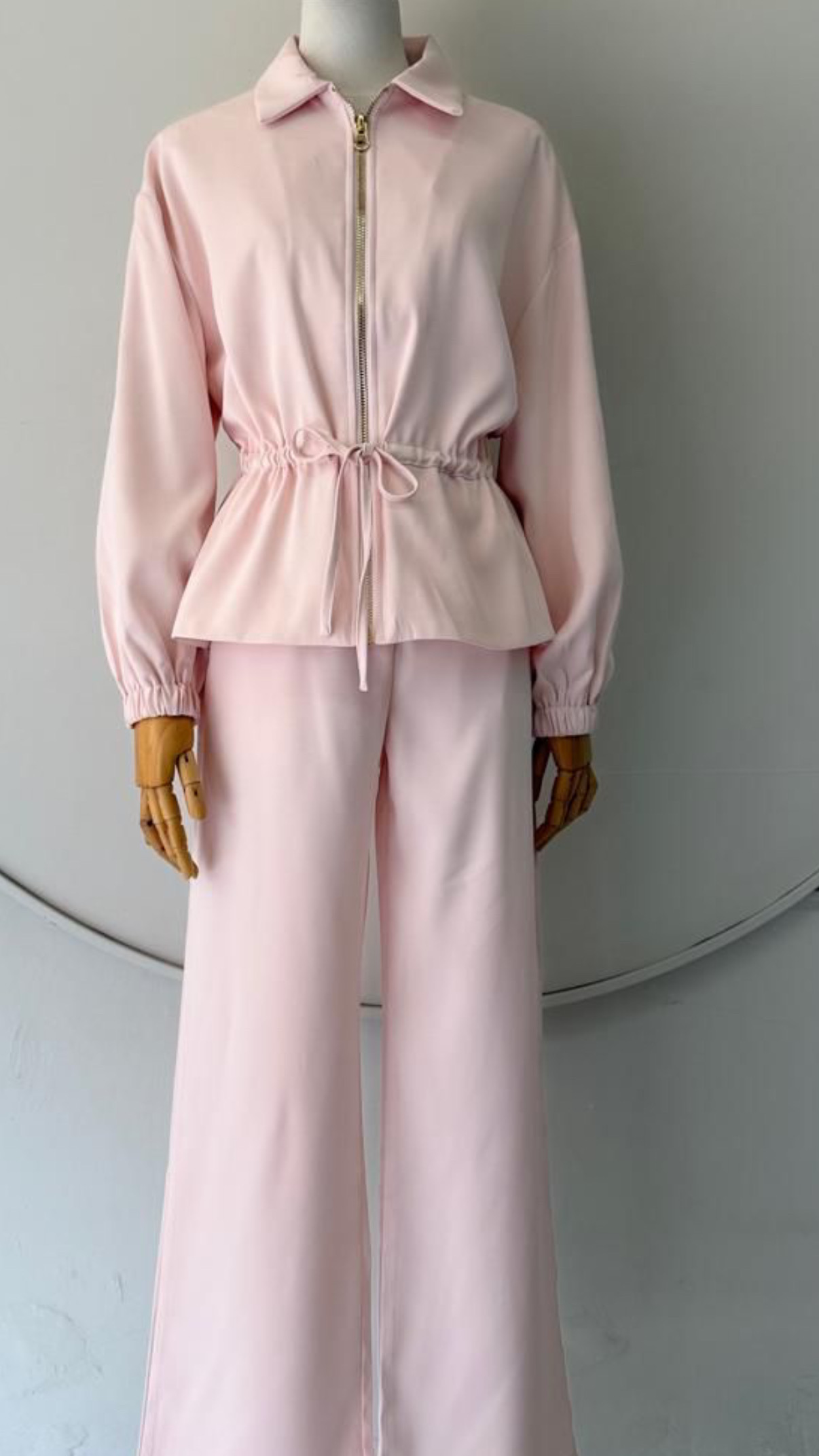 Set de Chaqueta/blusa y pantalón vibe súper elegante–minimal–clean girl luxe. La cintura ajustable marca la silueta y el pantalón recto alarga las piernas