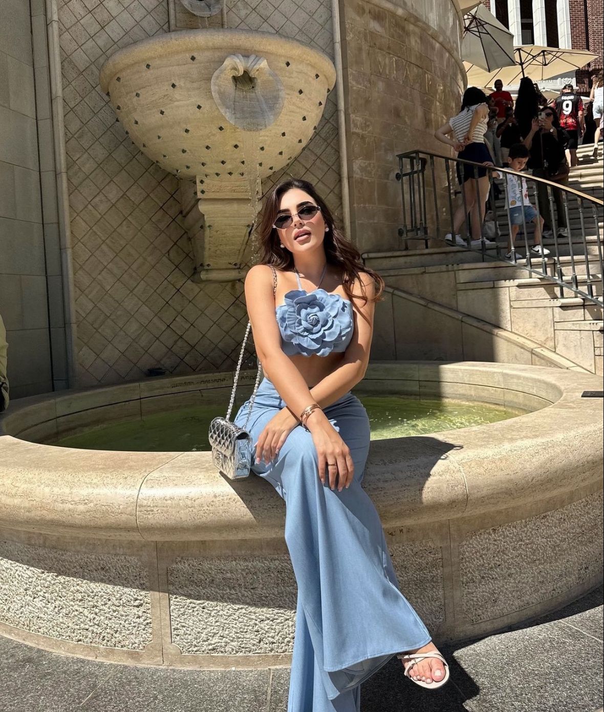 Conjunto de top halter y cierre de cremallera en espalda, con detalle frontal de flor y pantal贸n de cintura alta, recto y piernas anchas. Cierre de cremallera posterior.