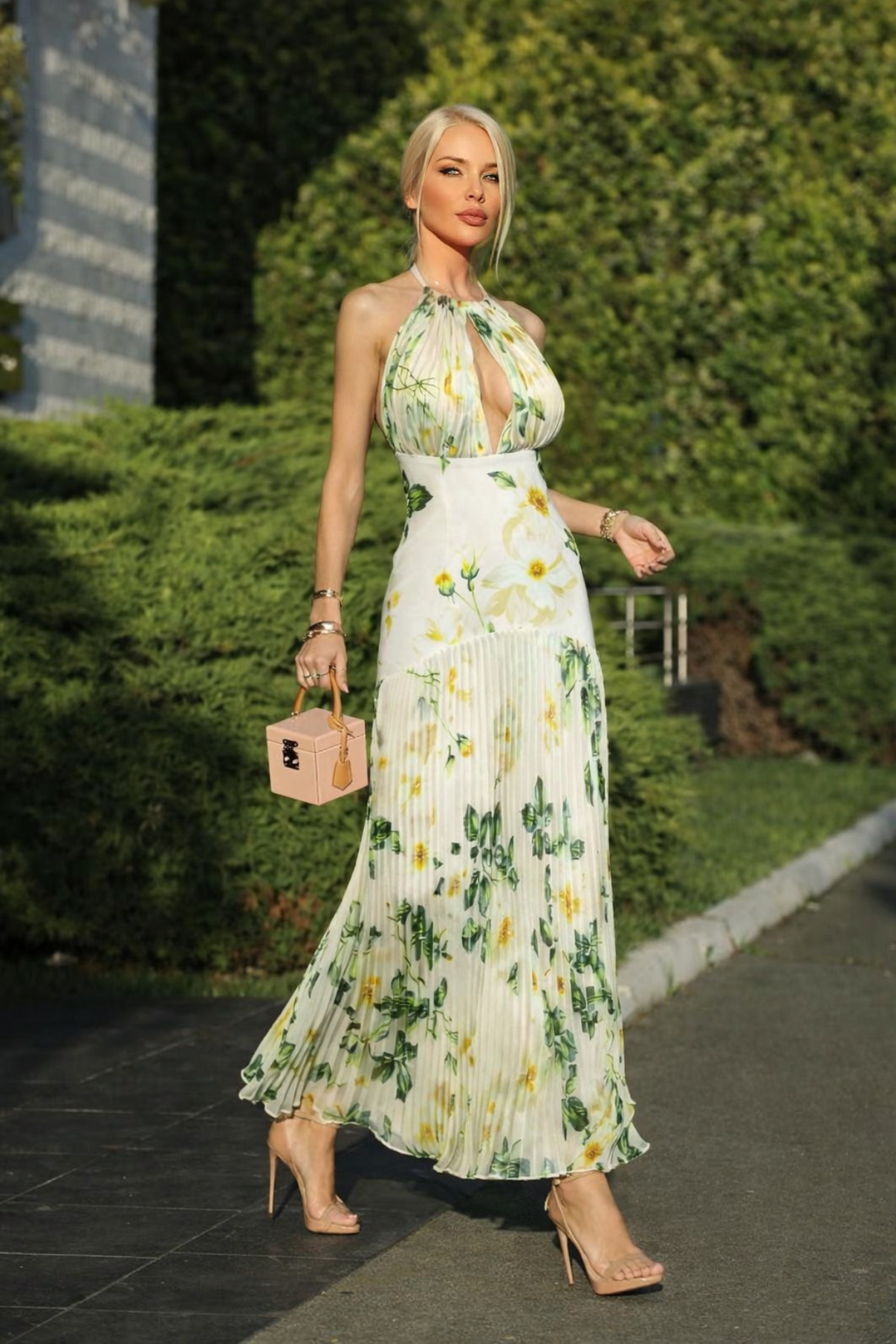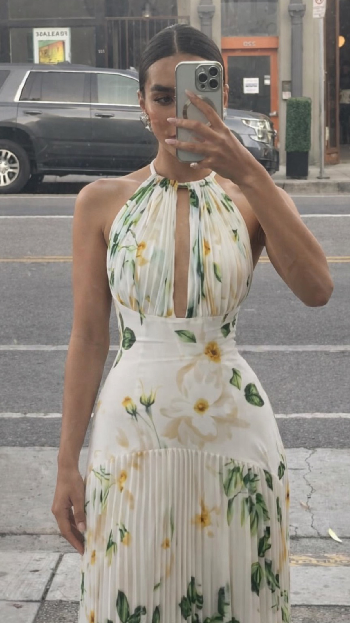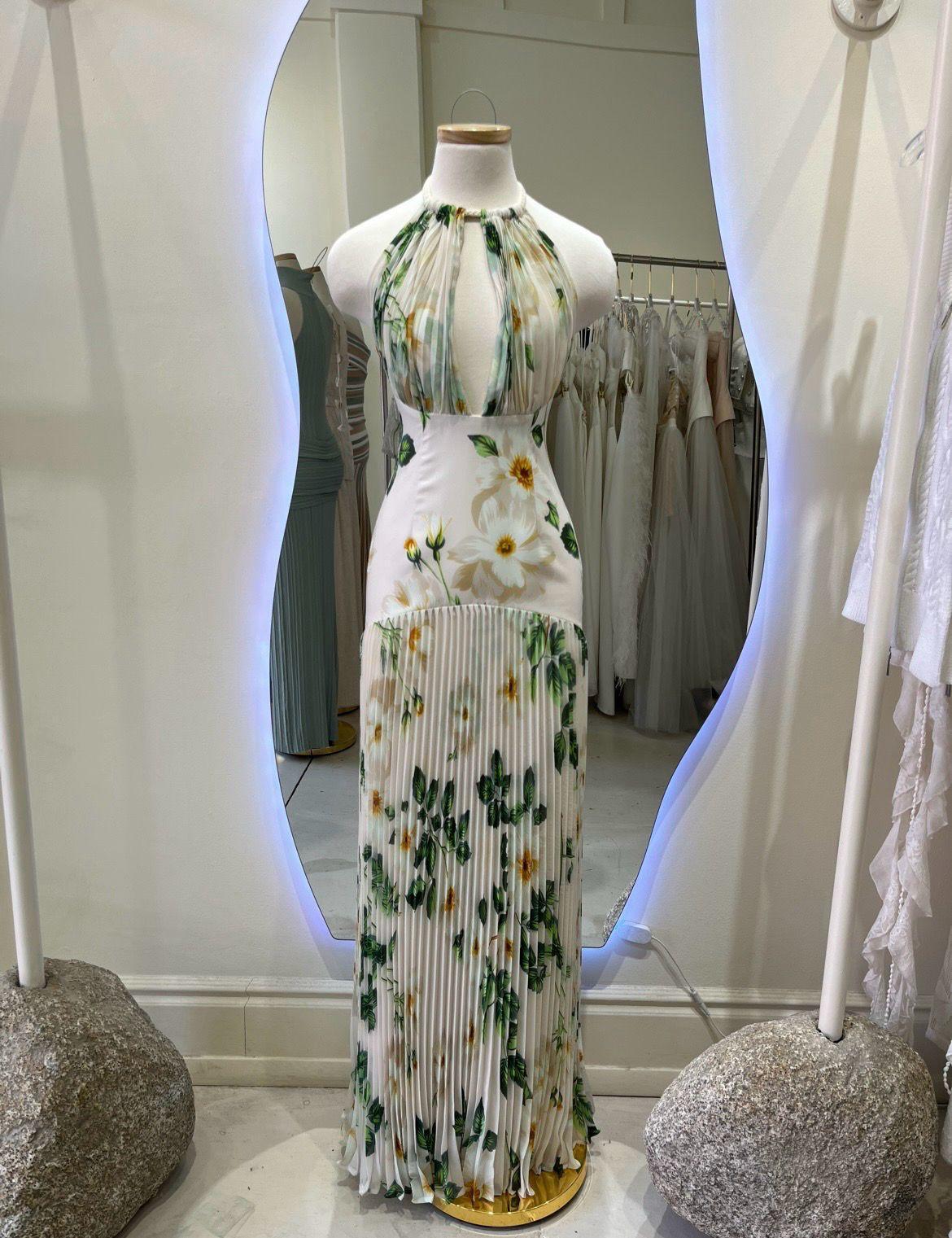 Diseño largo con delicado estampado floral, escote halter con abertura y falda plisada que crea un movimiento femenino y sofisticado al caminar.
