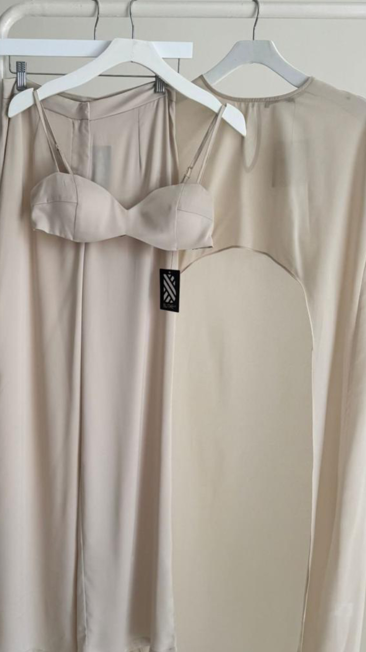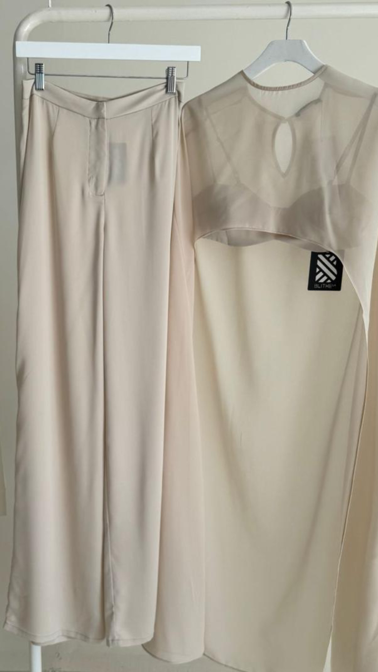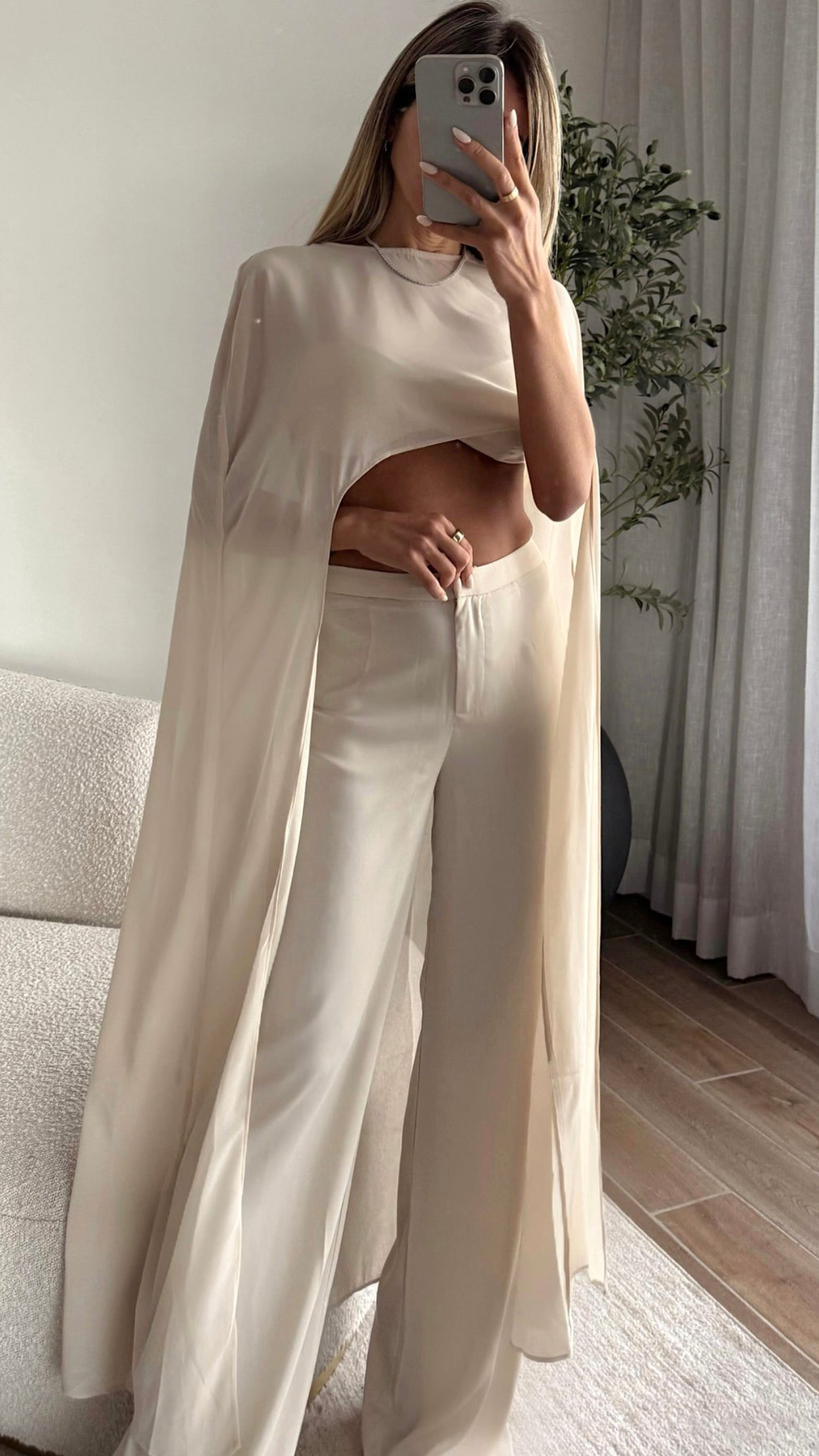 Impresionante set de 3 piezas de top con ensamble y pantalón en corte recto.