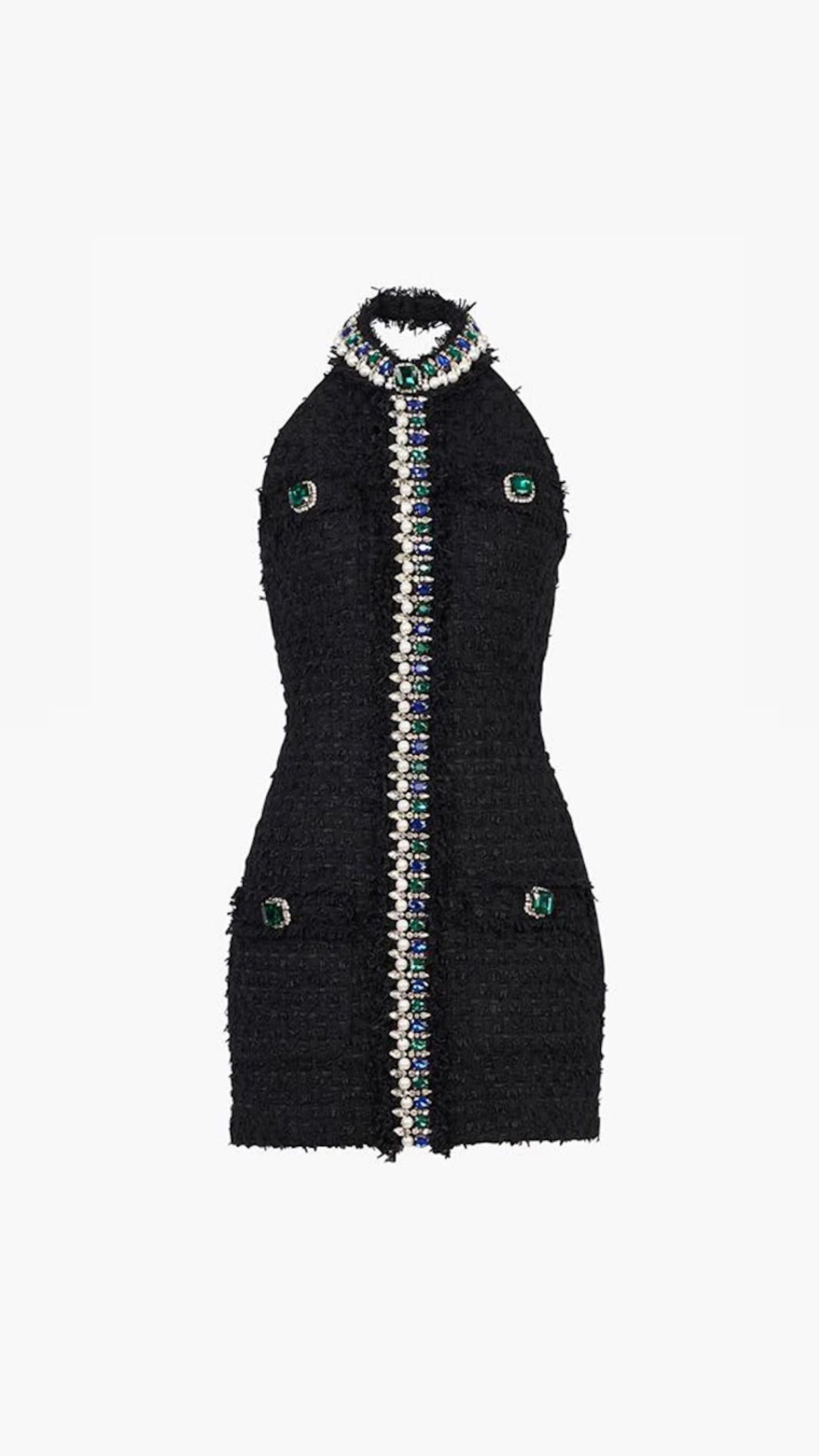 Un must de temporada 🖤 Vestido corte halter y blazer con pedrería en increíble combinación de colores.