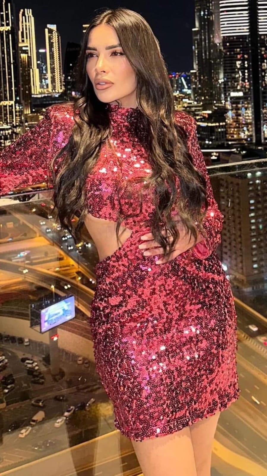 Sequin woven. Cuello alto. Broche desmontable de pedrería rosa. Cremallera en parte posterior invisible. Detalle de recorte en cintura que ayuda a acentuarla.
